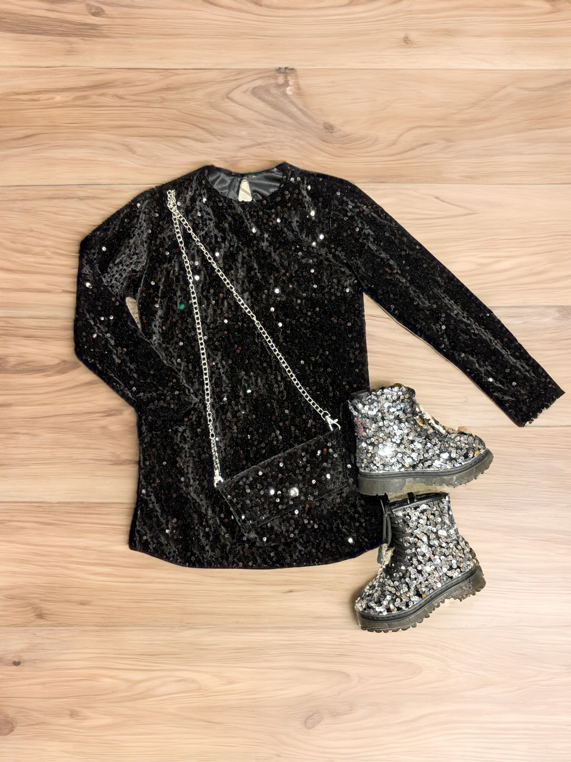 Deze prachtige shimmer jurk in de kleur zwart, en met bijhorende tas.